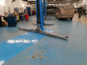 Montáž 2-sloupového bezpřejezdového zvedáku EE-C12E s nosností 6 tun v autoservisu Ford.